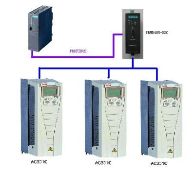 成本是怎么降低的?首先,ACS510标配有MODBUS通讯接口,没有额外费用。通过MODBUS转PROFIBUS网关就可以将ACS510接入到PROFIBUS。由于MODBUS一端可以接多台从站设备,一个MODBUS转PROFIBUS网关可以接多台变频器,这样等于多台变频器通过一个网关就可以将数据顺利的送入PROFIBUS总线中。为用户节约了大量成本,尤其是变频器应用较多时候,此成本优势变得十分重要。连接示意图如下